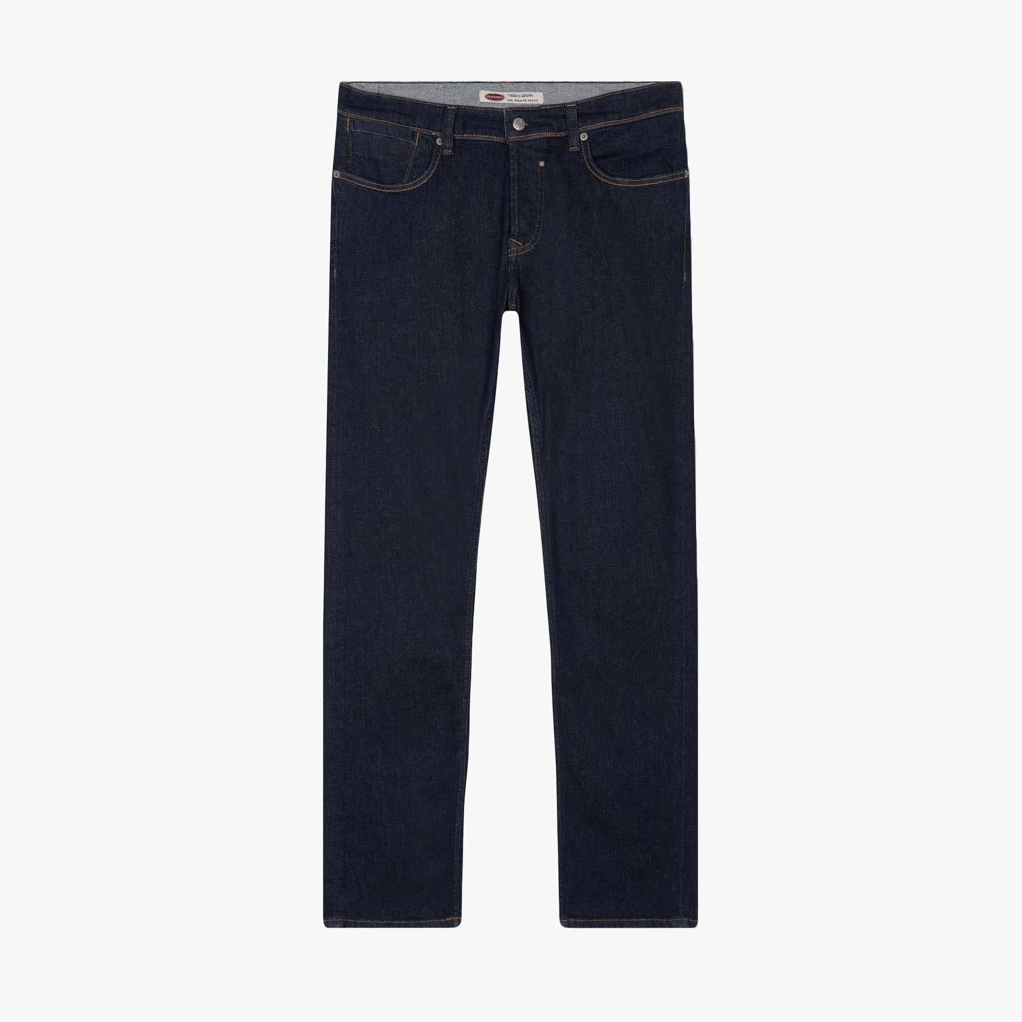 Jeans de coupe droite ajustée, taille basse, fermeture par bouton et braguette zippée. Denim 5 poches.